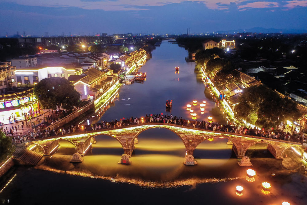 10月2日,游客在塘栖古镇的广济桥观赏运河夜景(无人机照片)。 新华社记者 徐昱 摄